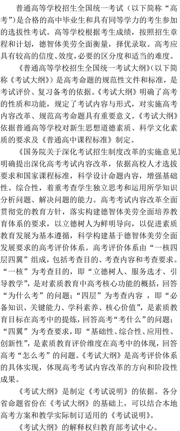 普通高等学校招生全国统一考试大纲是高考命题的规范性文件和标准。根据高考内容改革要求修订考试大纲,是保证考试科学公平、促进素质教育发展的一项重要工作。现将2019年普通高等学校招生全国统一考试大纲予以公布。
