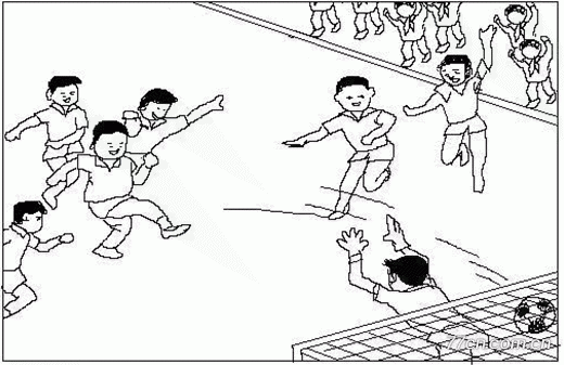 小刚刚要踢的时候,丁丁飞快地拦住球,小明去抢小刚踢的球,只见他一伸脚就把球带过来,小明对准球王使劲一踢,啪的一声,球进了球网里,小明高兴得手舞足蹈。
